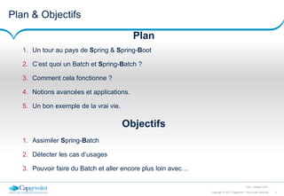 Le document présente une introduction au framework Spring et à Spring Batch, en détaillant leur utilisation pour le traitement par lots de données. Il explique le fonctionnement de Spring Batch, ses concepts, et fournit des exemples concrets d'application avec des illustrations de code. Les objectifs incluent l'assimilation de Spring Batch et l'élaboration d'applications robustes pour le traitement de gros volumes de données.