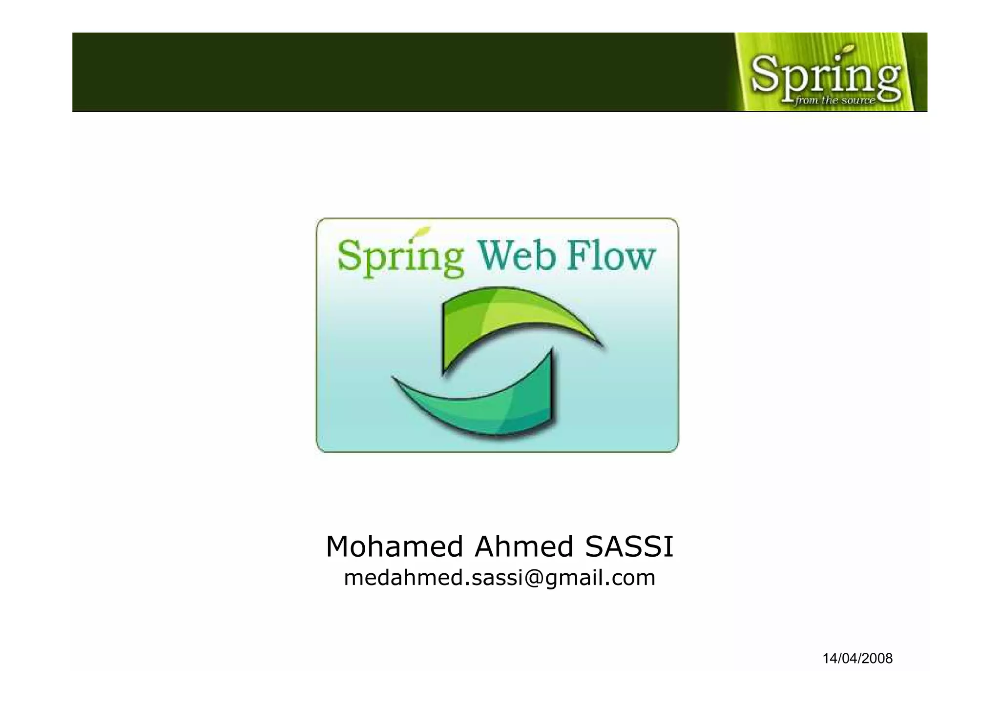 Spring Web Flow est un sous-projet du Spring Framework qui permet de créer des modules réutilisables appelés flows. L'auteur, Mohamed Ahmed Sassi, est consultant JEE et souligne l'importance de Spring Web Flow dans le développement d'applications web. Le document présente également une structure organisationnelle et un aperçu d'exemples de démonstration.