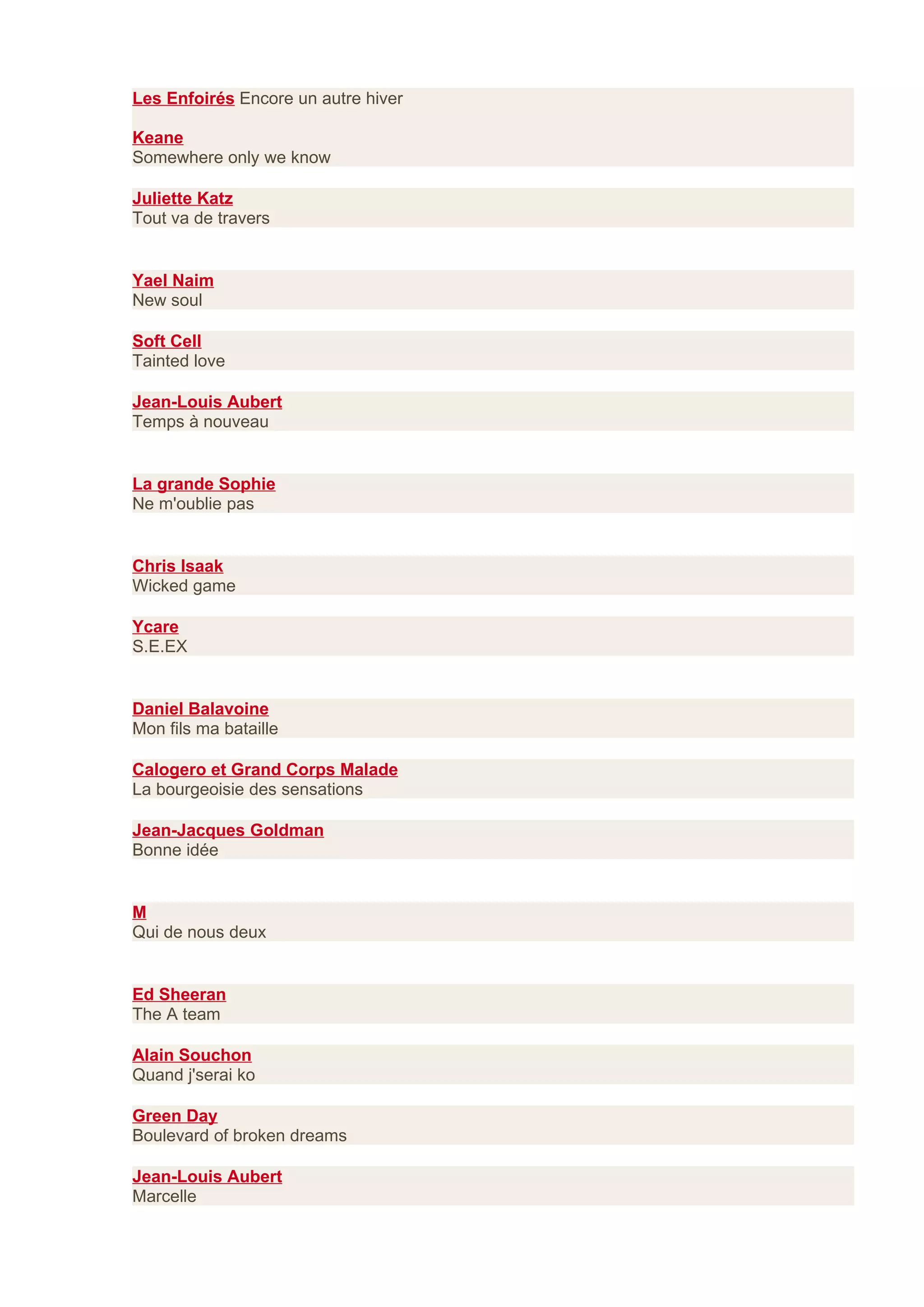 Le document énumère une liste de chansons et d'artistes divers, reflétant un éventail de genres musicaux. Il inclut des titres emblématiques et contemporains, soulignant la diversité de la scène musicale. Cette compilation met en avant des morceaux qui traversent les époques et les styles.