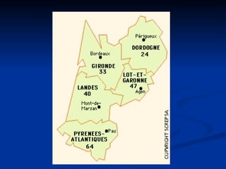L'Aquitaine est une région administrative du sud-ouest de la France, couvrant une superficie de 41 400 km² avec une population de 2 908 300 habitants. Elle se compose de cinq départements et est caractérisée par un climat tempéré, une économie diversifiée principalement tournée vers le secteur tertiaire, l'agriculture et l'industrie. Bordeaux est le principal centre urbain de la région, renommée pour ses vignobles, son patrimoine architectural et ses activités touristiques.