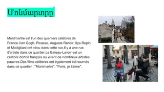 Montmartre est un quartier célèbre de France, connu pour avoir été le foyer d'artistes tels que Van Gogh et Picasso. Le musée de Montmartre y retrace son histoire depuis le XIIe siècle, tandis que des films notables ont été tournés dans la région. Le quartier abrite également des éléments emblématiques comme le mur des 'je t'aime' et les derniers moulins à vent.