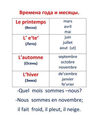Le document décrit les saisons et les mois de l'année en français, avec les mois associés à chaque saison. Il mentionne également les conditions météorologiques en novembre, précisant qu'il fait froid et qu'il pleut ou neige. Enfin, une question sur le mois en cours est posée.