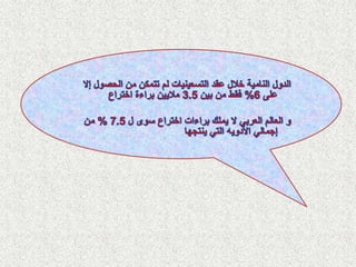 Le document présente les informations de contact de Dr. Ahmed H. Hussein et fournit des données sur le marché pharmaceutique mondial, y compris les classements par pays et les chiffres de croissance. Il met en avant les molécules les plus précieuses en Irak pour 2012 et les principales entreprises pharmaceutiques mondiales avec leurs performances respectives. Enfin, il décrit les principales zones thérapeutiques et leurs valeurs sur le marché global des médicaments.
