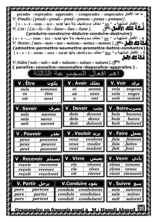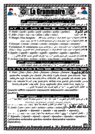 Le document présente une analyse des conjugaisons des verbes français, organisées en trois groupes selon leurs terminaisons: 'er', 'ir', et 're'. Chaque groupe est accompagné d'exemples de verbes, de règles spécifiques pour la conjugaison au présent, et des variations pour certains verbes irréguliers. Il aborde également les formes de verbes pour des instructions, des demandes et des futurs proches.