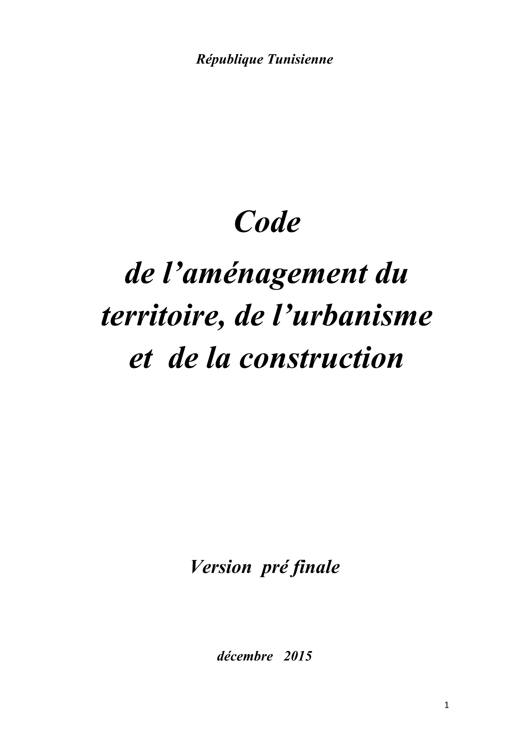 Le document présente le code de l'aménagement du territoire, de l'urbanisme et de la construction en Tunisie, soulignant les dispositions générales et les principes régissant l'organisation de l'espace. Il établit les missions et le fonctionnement des comités interministériels et régionaux, ainsi que les outils d'urbanisme et les règlements concernant le développement urbain et la protection de l'environnement. L'objectif global est d'assurer un développement durable et cohérent à l'échelle nationale et régionale.