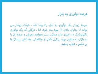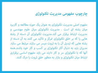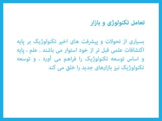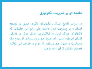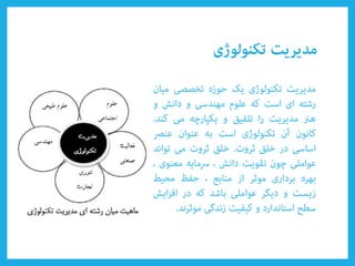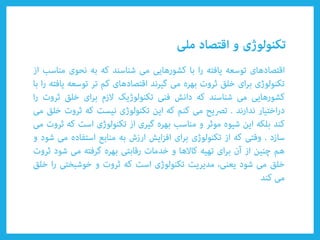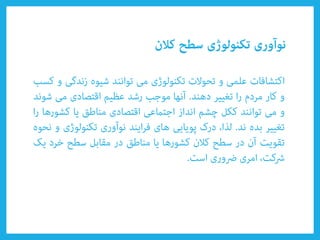 Le document aborde divers types de technologies telles que les technologies émergentes et appropriées, ainsi que leur impact sur la compétitivité nationale et la croissance économique durable. Il évoque également des concepts clés tels que la créativité, l'innovation, et l'importance des organisations adaptatives. Enfin, il souligne le rôle du savoir tacite et des poches d'innovation dans l'amélioration technologique.