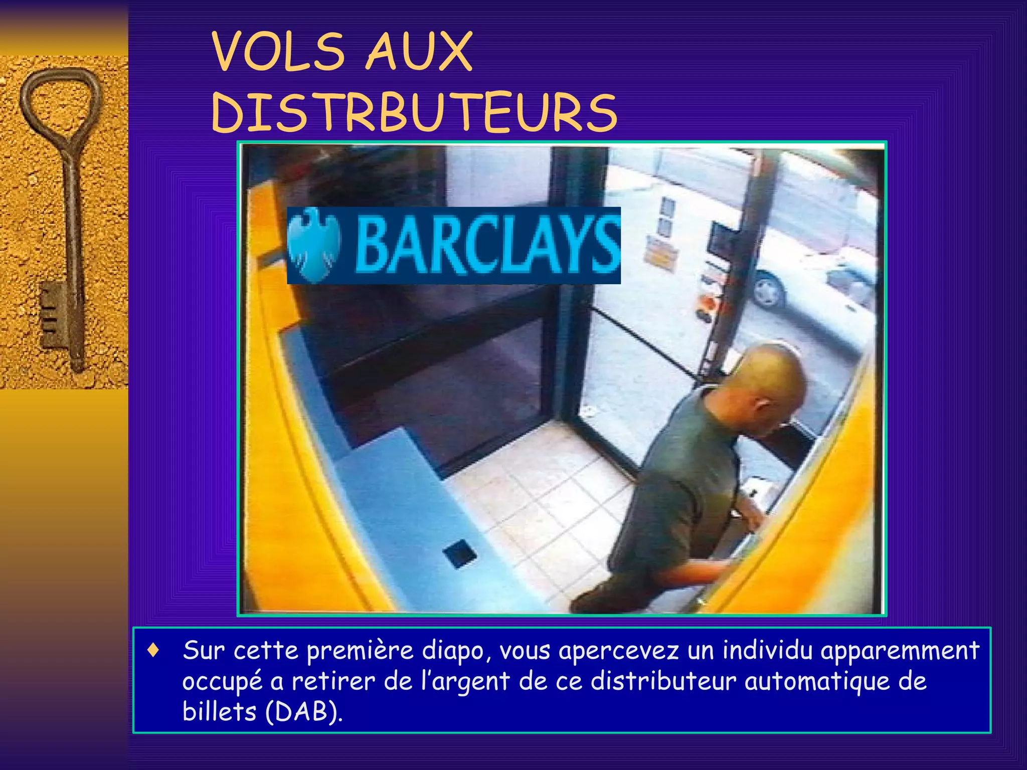 Le document décrit une technique de fraude aux distributeurs automatiques de billets (DAB) où un individu place un piège pour retenir une carte bancaire, permettant ainsi au complice de voler le code PIN de la victime. Le piège est réalisé à partir d'un film noir, rendant difficile son identification par les clients. Il est recommandé aux victimes de vérifier les anomalies sur les DAB, de prévenir leur banque immédiatement et de partager cette information pour éviter d'autres victimes.