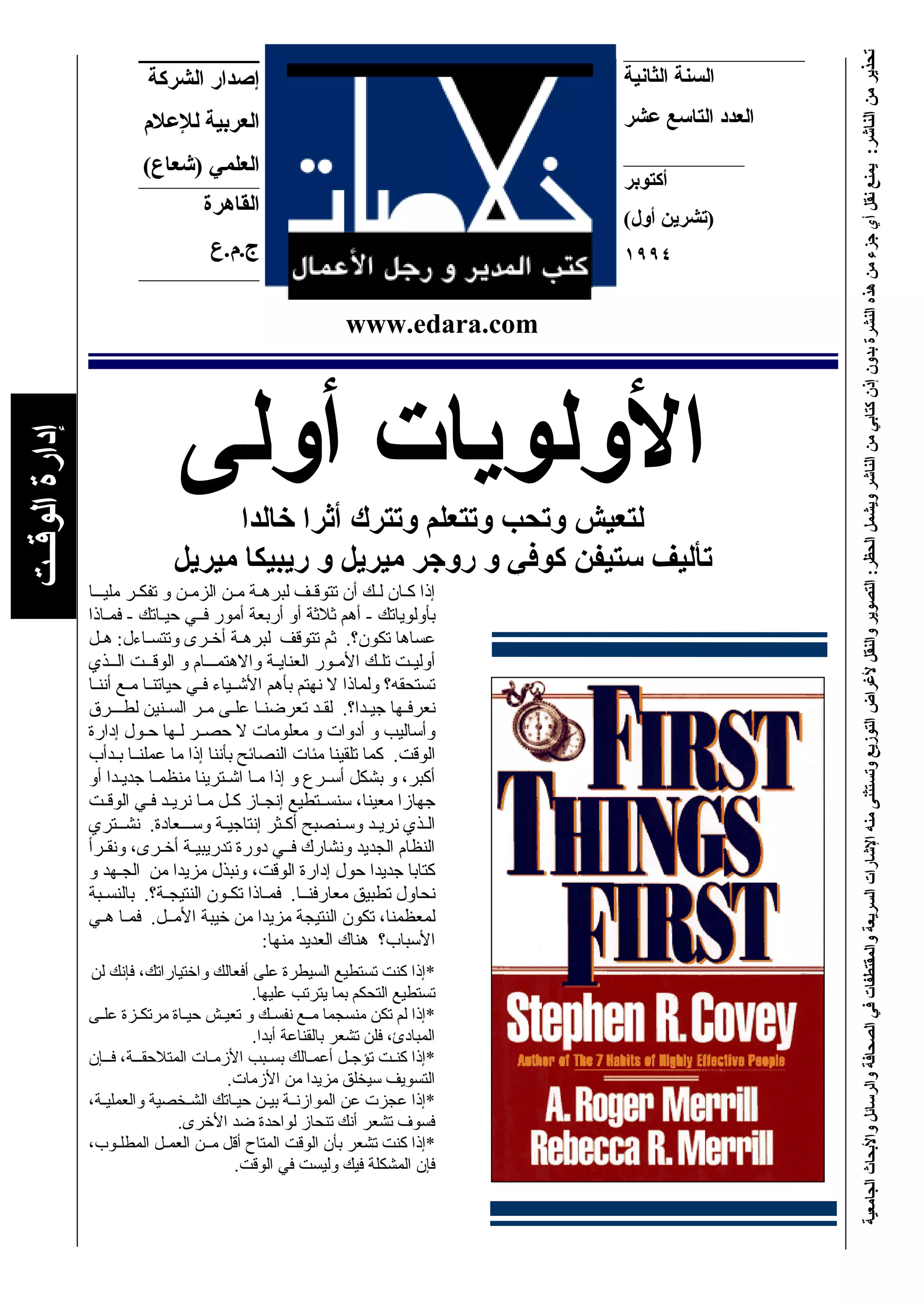 Le document présente le livre 'First Things First' de Stephen R. Covey, A. Roger Merrill et Rebecca Merrill, publié par Simon & Schuster en 1994. Ce livre se concentre sur la gestion du temps et l'importance de prioriser les tâches. Il fournit des concepts clés pour améliorer la productivité personnelle et professionnelle.