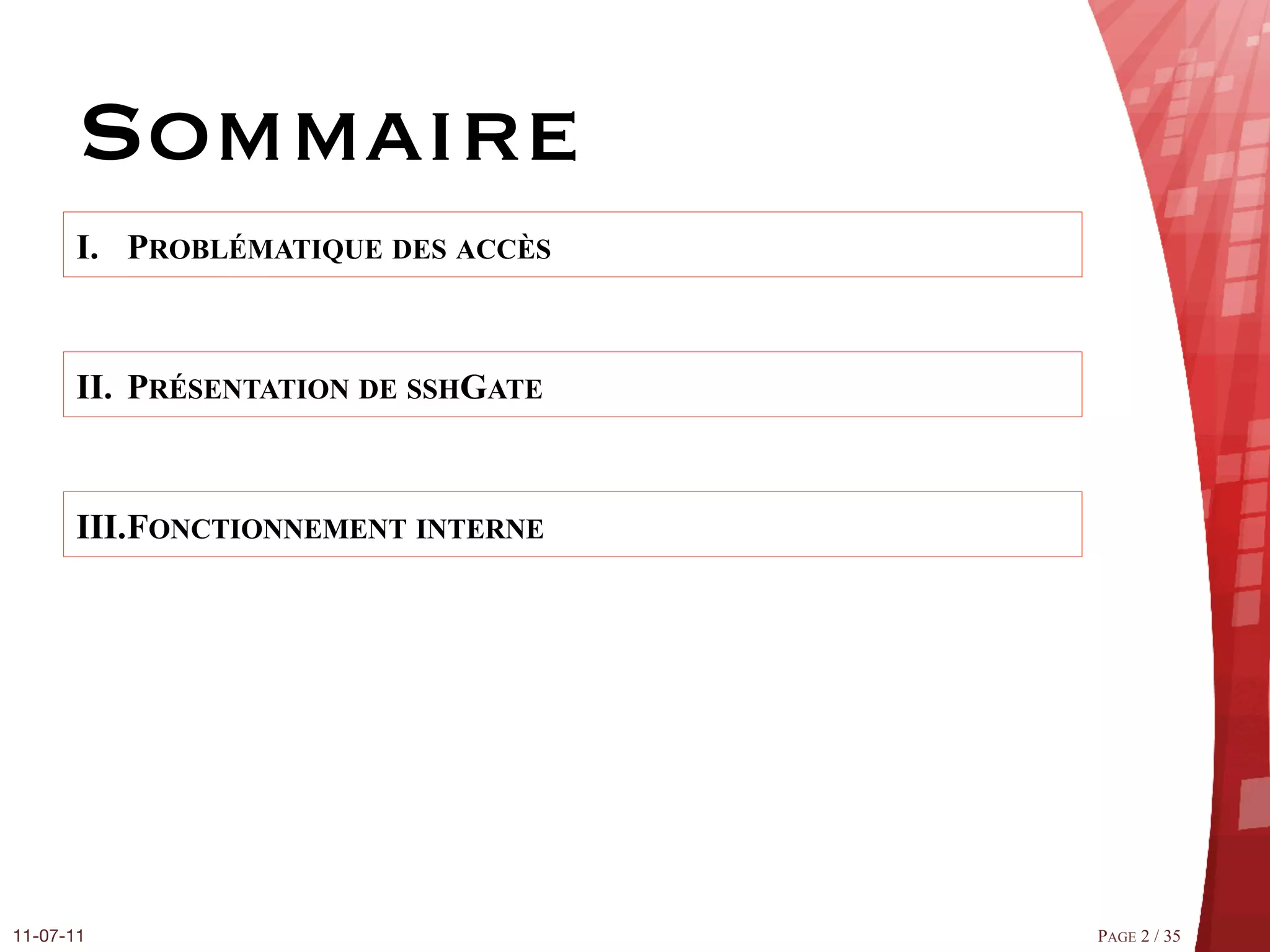 Le document présente une synthèse sur la problématique des accès aux serveurs, en se concentrant sur la solution SSHGate, qui propose une gestion centralisée des accès tout en garantissant une sécurité renforcée par l'utilisation de clés SSH. SSHGate est un logiciel open-source développé pour optimiser l'accès aux serveurs tout en évitant les installations sur les systèmes administrés, et permet d'enregistrer les activités des utilisateurs. Il décrit également le fonctionnement interne de l'outil, ses fonctionnalités et les défis rencontrés durant son développement.