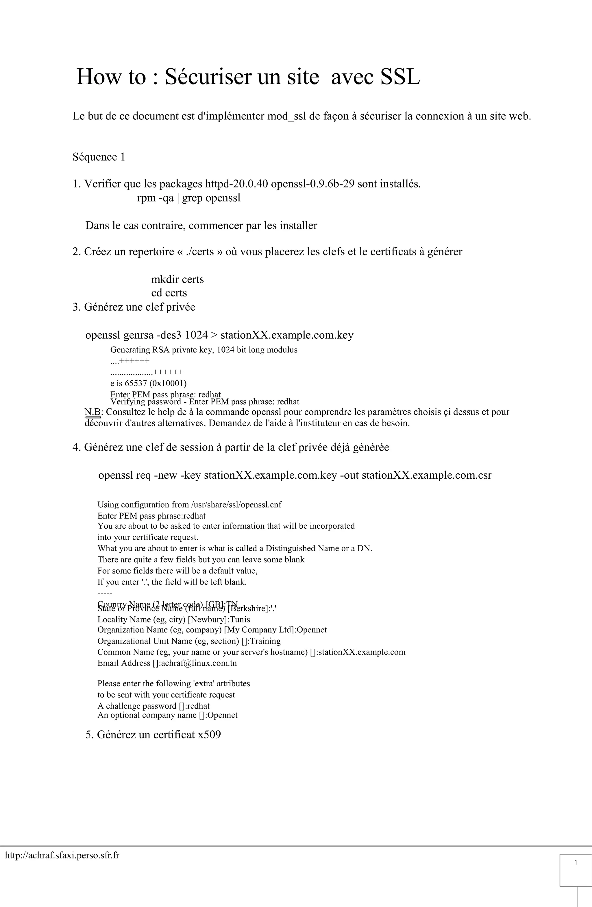 Ce document explique comment sécuriser un site web en implémentant mod_ssl, en détaillant les étapes de vérification des packages nécessaires, de génération de clés privées et de certificats, et de configuration du serveur Apache. Il inclut également des instructions pour créer des répertoires sécurisés et non sécurisés avec des pages HTML correspondantes, ainsi que des modifications à apporter aux fichiers de configuration. Enfin, il fournit des indications sur le processus de redémarrage du service HTTPD et de vérification de la connexion sécurisée via un navigateur.