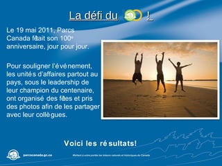 Le 19 mai 2011, Parcs Canada a célébré son 100e anniversaire avec des événements organisés dans tout le pays, réunissant des employés et leurs familles pour des fêtes, des barbecues, et diverses activités marquant l'occasion. Chaque unité de gestion a contribué à ces célébrations uniques, telles que des tournois de mini-golf, des sauts en extérieur et des délices culinaires pour renforcer l'esprit communautaire. Le centenaire a été célébré de manière créative, avec un mélange d'activités festives et de reconnaissance pour le service des employés.