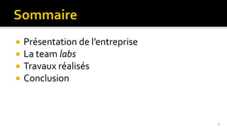 Le document présente un historique et une organisation d'une entreprise fondée en 2008, ayant levé des fonds significatifs et développant des technologies comme le PaaS multi-langage. Des projets open-source et des outils de développement y sont décrits, dont une librairie pour interfacer divers systèmes et un outil de composition de stack. La conclusion souligne une expérience positive et des perspectives de carrière enrichissantes pour les employés au sein de la start-up.