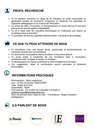 LearnAssembly est une startup edtech en forte croissance spécialisée dans la transformation numérique des entreprises. Elle recherche un stagiaire en innovation pédagogique pour participer à la conception de parcours de formation sur différents formats, tout en assurant une veille technologique. Le profil recherché est un étudiant passionné par les défis, l'innovation et les nouvelles technologies, avec de bonnes capacités rédactionnelles.