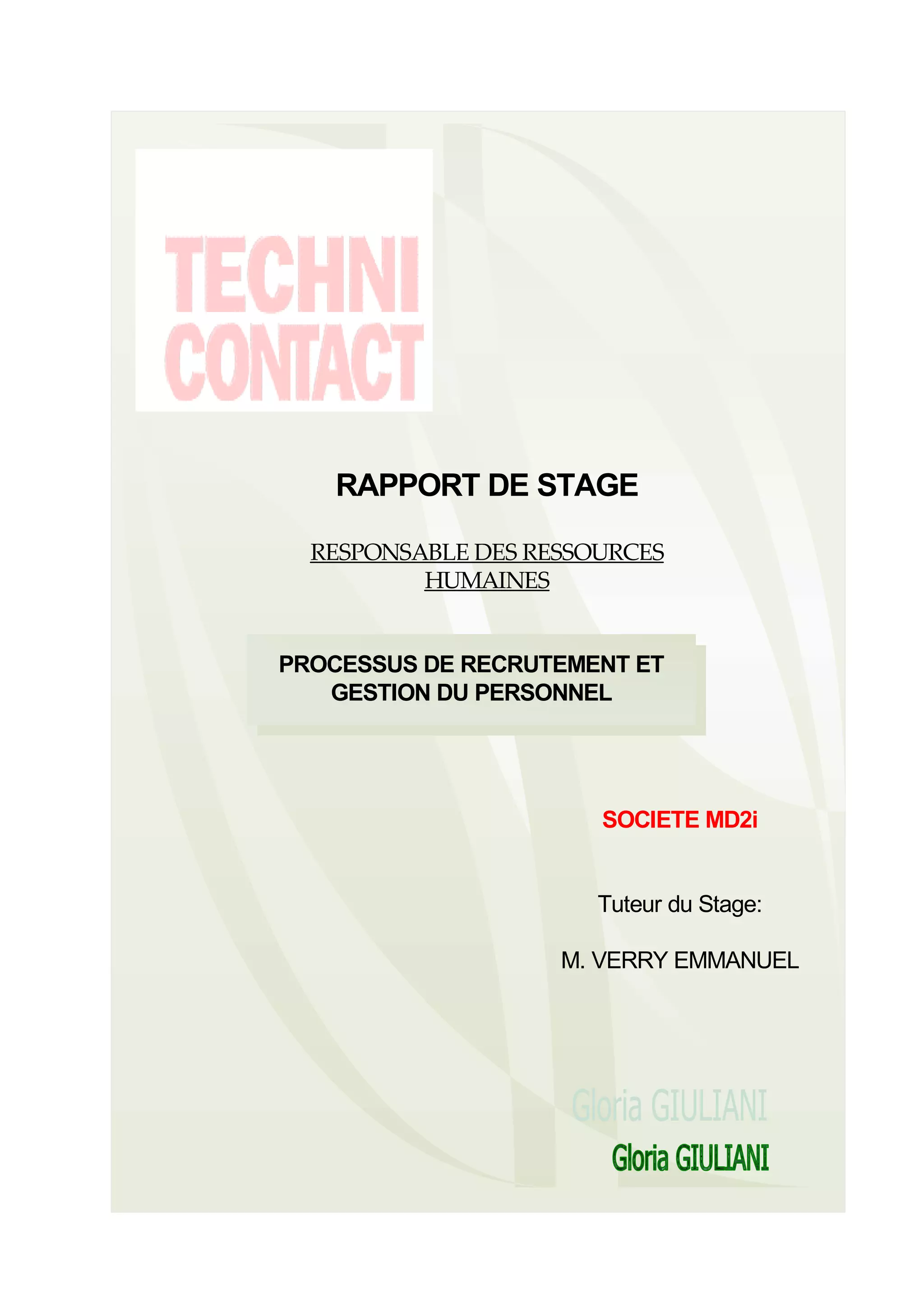Le rapport de stage de Gloria Giuliani décrit son expérience au sein de la société MD2i dans le cadre de sa formation en ressources humaines, entre le 15 janvier et le 23 février 2007. Elle a été responsable du recrutement et de la gestion du personnel, acquérant des compétences pratiques grâce à une immersion dans l'entreprise et à l'encadrement de professionnels. Le document présente également une analyse détaillée de l'entreprise, son secteur, ainsi que des informations sur ses activités et ses concurrents.