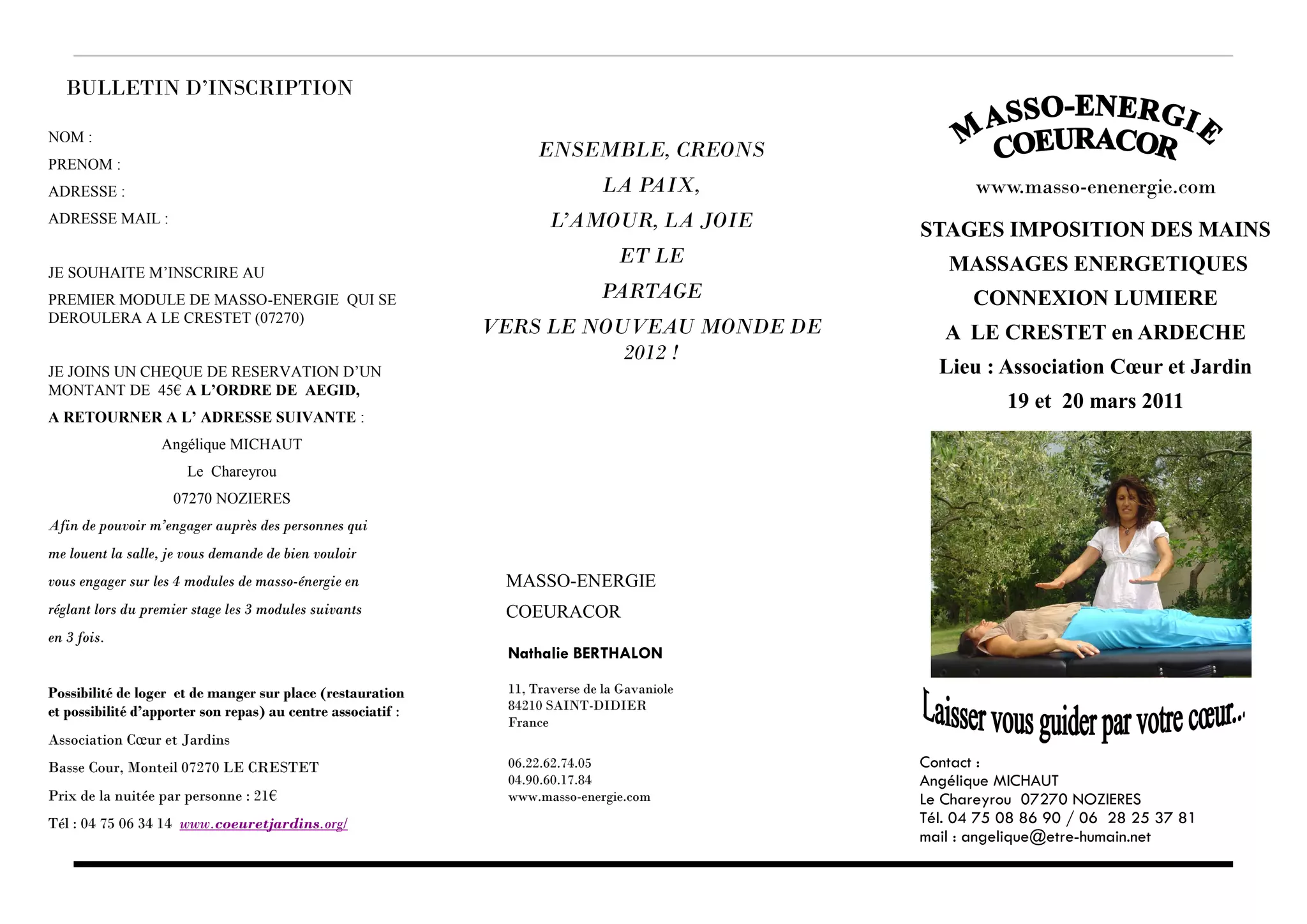 Le document est un bulletin d'inscription pour des stages de masso-énergie qui se dérouleront à Le Crestet en 2011, avec des détails sur les modules de formation, les tarifs, et les conditions d'hébergement. Il mentionne également les techniques de massage, l'importance de la connexion à la lumière, et fournit des coordonnées de contact pour plus d'informations. Les stages incluent des sessions sur l'harmonisation des chakras et l'imposition des mains.
