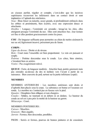 Le document présente un standard de race pour un chien courant britannique, dont la classification est dans le groupe 6 FCI, avec un accent sur son aspect physique, son comportement et ses caractéristiques de santé. Le chien est décrit comme énergique, intelligent et amical, avec des spécifications précises sur la morphologie, y compris la tête, les membres et la robe. Les critères de taille et les défauts physiques ou comportementaux sont également abordés, entraînant des pénalités ou une disqualification selon leur gravité.