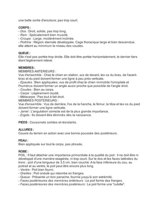 Le document est un standard FCI pour le chien de chasse polyvalent Langhaar, publié le 16 mars 2001, qui décrit ses caractéristiques physiques, son comportement et ses exigences de race. Il précise les proportions, les traits de la tête, la robe, la couleur et les défauts de cette race, tout en stipulant des critères de disqualification. La taille idéale pour les mâles est de 63 à 66 cm et pour les femelles de 60 à 63 cm, avec un poids d'environ 30 kg.