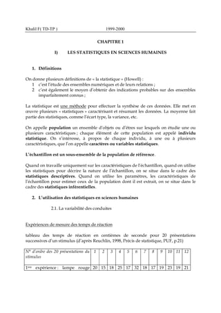 Ce document présente une introduction aux statistiques appliquées aux sciences humaines, en détaillant les définitions et les méthodes statistiques, notamment les statistiques descriptives et inférentielles. Il explore la variabilité des mesures et les différentes variables ainsi que leurs niveaux de mesure, incluant des exemples d'application en psychologie. Enfin, il aborde la représentation graphique des données selon le type de variable, utilisant des diagrammes à secteurs, des diagrammes en bâtons, et des histogrammes.