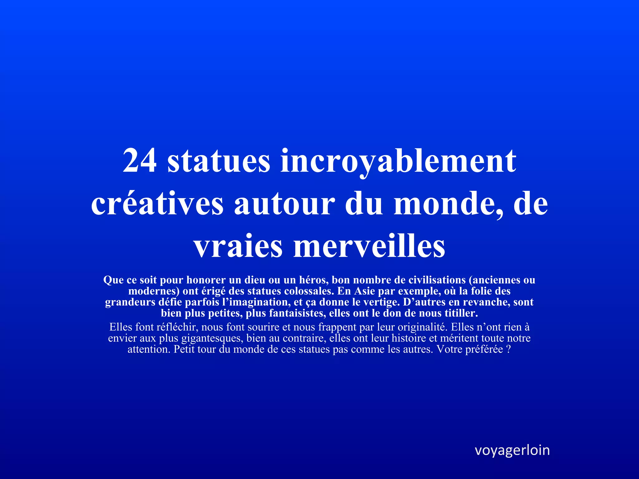 Le document présente 24 statues créatives à travers le monde, allant des œuvres colossales aux créations plus petites et fantaisistes. Chaque statue, qu'elle honore un dieu ou un héros, apporte une originalité qui suscite réflexion et sourire. Un tour du monde illustré des statues uniques témoigne de l'histoire et de la signification de chacune d'elles.
