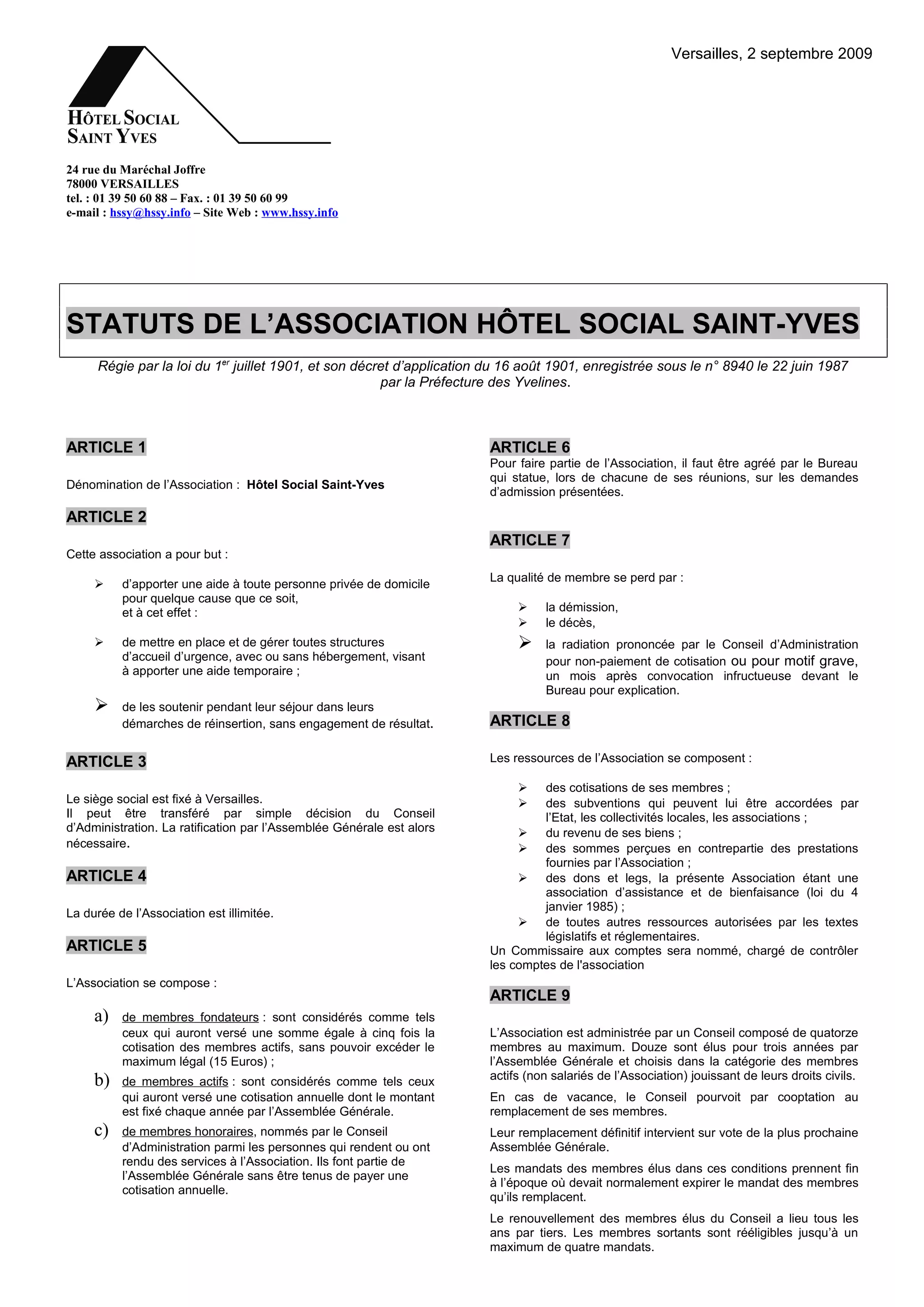 L'association Hôtel Social Saint-Yves, régie par la loi de 1901, a pour mission d'apporter une aide aux personnes sans domicile en gérant des structures d'accueil temporaire. Son fonctionnement repose sur des cotisations, subventions et dons, et est administré par un conseil d'administration élu par les membres. Les statuts prévoient également des dispositions pour la dissolution de l'association et la gestion de son patrimoine.
