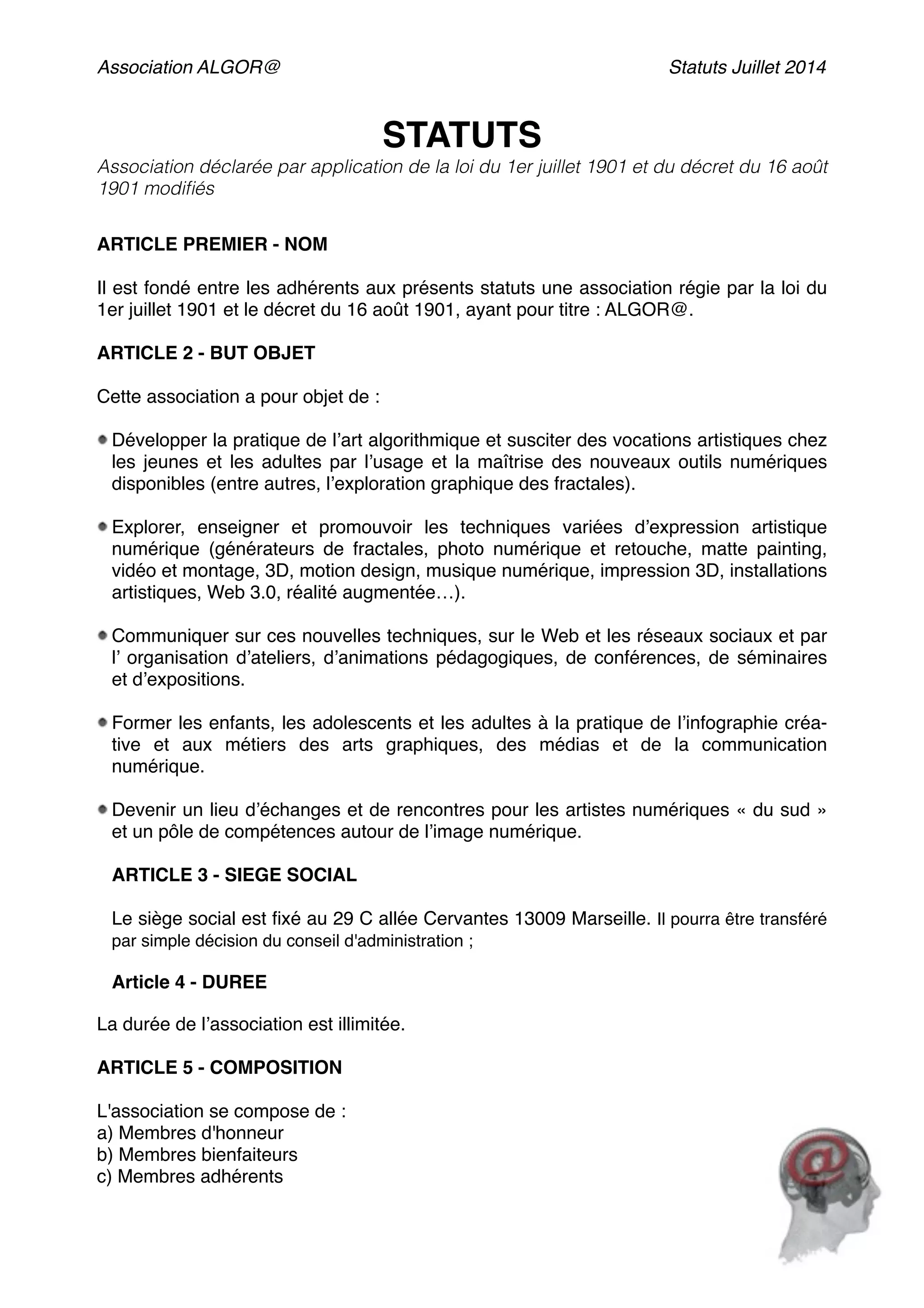 L'association Algor@, fondée en juillet 2014, a pour but de promouvoir l'art algorithmique et les techniques d'expression artistique numérique à travers des ateliers et des formations. Elle est régie par la loi de 1901 et regroupe différentes catégories de membres, chacun soumis à des conditions spécifiques de cotisation et d'admission. Le siège social est situé à Marseille et l'association peut également recruter des membres, gérer des ressources et convoquer des assemblées générales pour ses décisions administratives.