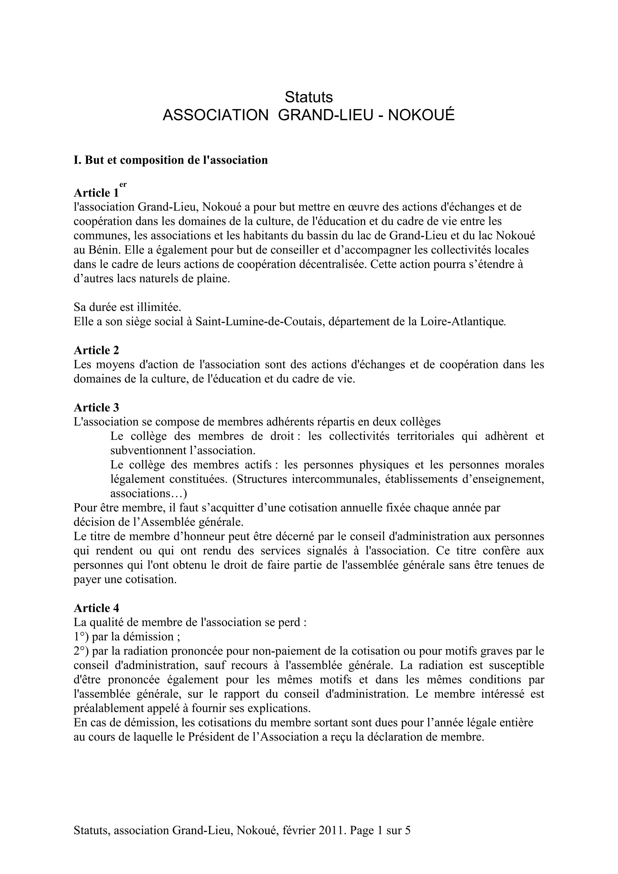 L'association Grand-Lieu, Nokoué vise à promouvoir l'échange et la coopération dans les domaines culturels, éducatifs et environnementaux entre les communes autour des lacs de Grand-Lieu et Nokoué au Bénin. Elle est composée de membres adhérents, répartis entre des collectivités territoriales et des membres actifs, et est dirigée par un conseil d'administration. L'association se finance par les cotisations, les subventions et les dons, et peut être dissoute par une assemblée générale suivant des modalités précises.