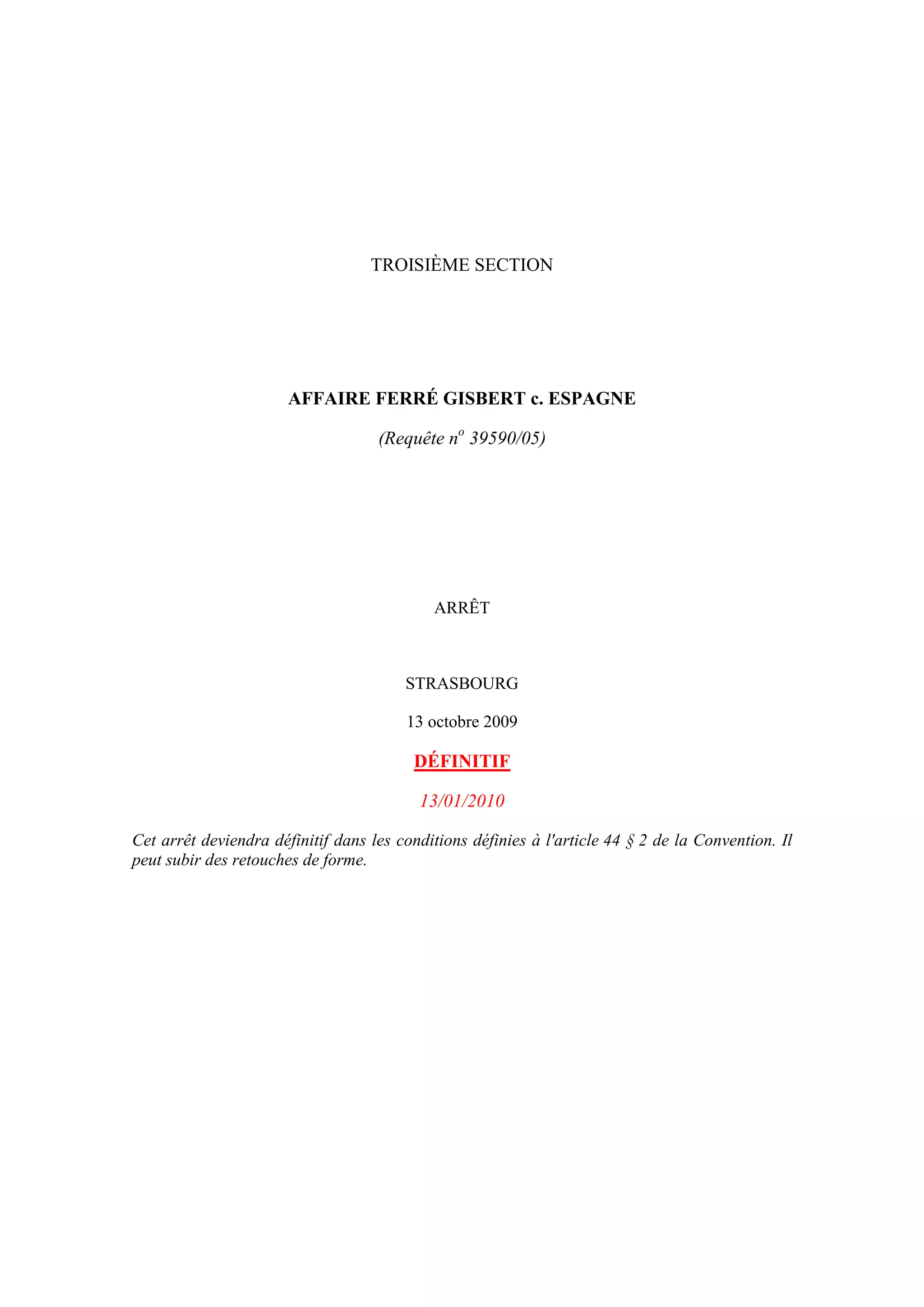 Dans l'affaire Ferré Gisbert c. Espagne, le requérant a contesté une décision du tribunal constitutionnel espagnol le déclarant irrecevable pour tardiveté dans un recours d'amparo alleging une violation de son droit à un procès équitable. La cour a analysé les circonstances procédurales et a examiné si l'interprétation des délais par le tribunal était conforme aux droits de l'homme. Finalement, la cour a jugé que le gouvernement n'avait pas prouvé que les voies de recours internes avaient été épuisées et a considéré le grief comme recevable.