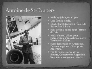 Antoine de Saint-Exupéry, né le 29 juin 1900 à Lyon, était un écrivain et aviateur ayant travaillé pour l'Aéropostale et écrit des œuvres emblématiques comme 'Le Petit Prince' et 'Terre des hommes'. Après plusieurs missions durant la Seconde Guerre mondiale, il disparut en 1944 lors d'une mission et son corps fut retrouvé des années plus tard. Son œuvre soulève des questions profondes sur l'enfance, la perception et l'essence de la vie.