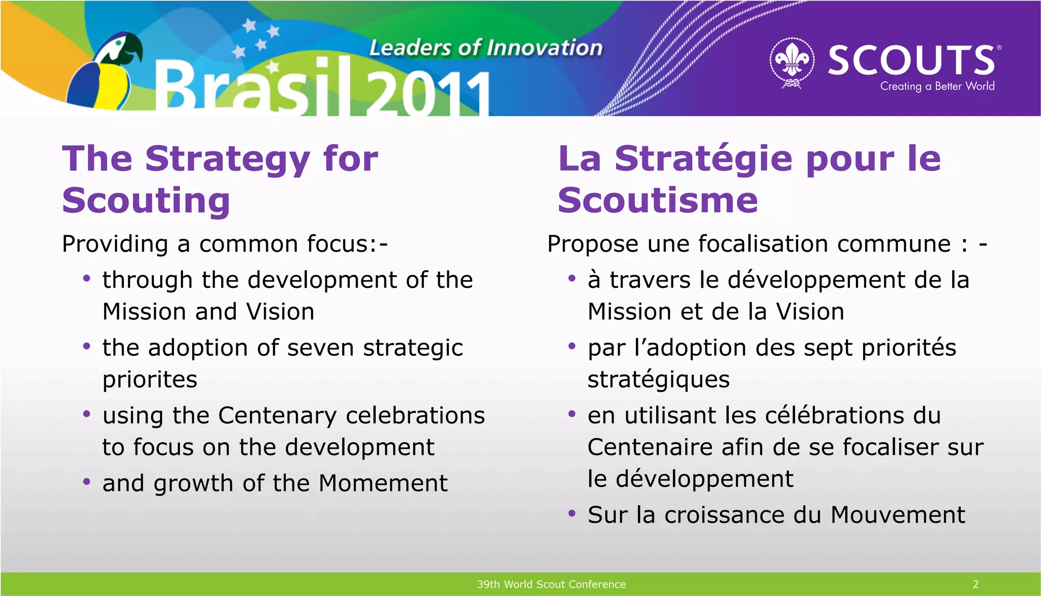 Le document présente la stratégie de coordination pour le scoutisme, se concentrant sur le développement et la croissance du mouvement à travers sept priorités stratégiques. Il souligne l'importance de renforcer la gouvernance et l'identité de marque, tout en encourageant les organisations nationales à utiliser ces priorités pour leurs propres stratégies. En outre, il propose un soutien ciblé pour aider ces organisations dans leur développement.