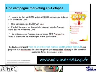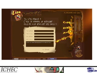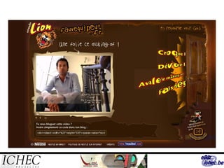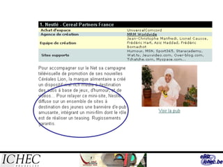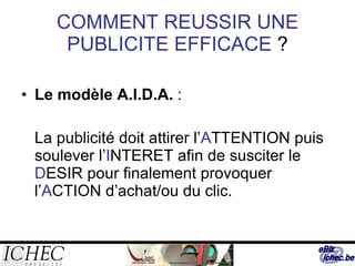 Ce document présente des stratégies de communication web pour une publicité efficace en se basant sur le modèle AIDA, qui se concentre sur l'attention, l'intérêt, le désir et l'action. Il aborde divers aspects de la publicité en ligne et l'importance d'une présence sur Internet, tout en soulignant les outils et techniques tels que les réseaux sociaux, le marketing viral, et le marketing direct pour attirer les consommateurs. Les publicités doivent être visuellement attrayantes et utiliser des mots percutants pour susciter l'engagement des internautes.