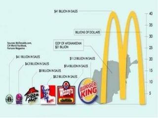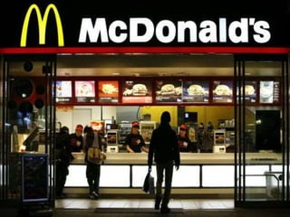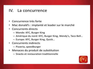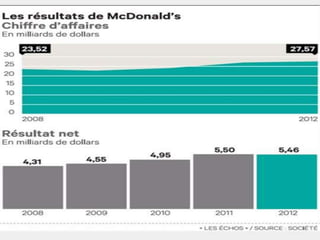 Le document présente une analyse complète de McDonald's, de sa définition à l'évolution de son logo, en passant par ses cibles marketing et sa stratégie économique. L'évolution historique de la chaîne montre sa croissance mondiale, tandis que sa communication et son marketing ciblent une vaste clientèle incluant enfants, jeunes adultes et professionnels. Malgré son succès, des questions se posent sur l'avenir de l'entreprise après une légère baisse de son chiffre d'affaires en 2012.