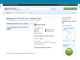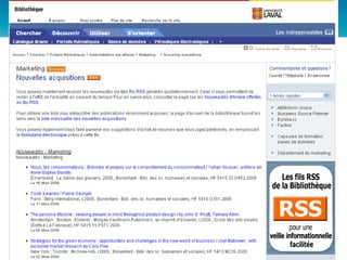 Le document explore les stratégies de la bibliothèque de l'Université Laval pour s'adapter aux changements du Web 2.0, mettant en avant l'importance de la participation et de la personnalisation des services. Il souligne les défis de se différencier dans un environnement numérique où la majorité des étudiants privilégient les moteurs de recherche. La bibliothèque a mis en place des initiatives telles que des portails thématiques et des outils collaboratifs pour mieux répondre aux besoins de ses usagers et améliorer son offre de services en ligne.