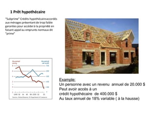 Le document traite de la crise des subprimes, expliquant comment des prêts hypothécaires risqués ont été accordés à des ménages insolvables, menant à une chute du marché immobilier. Il décrit également le rôle des titres adossés à des actifs (ABS) dans la titrisation, ainsi que les conséquences d'une mauvaise régulation et d'une complexité excessive des produits financiers. Enfin, il souligne l'effet systémique de la crise sur les banques et l'économie réelle, catalysé par une perte de confiance générale et la nécessité d'interventions des banques centrales.