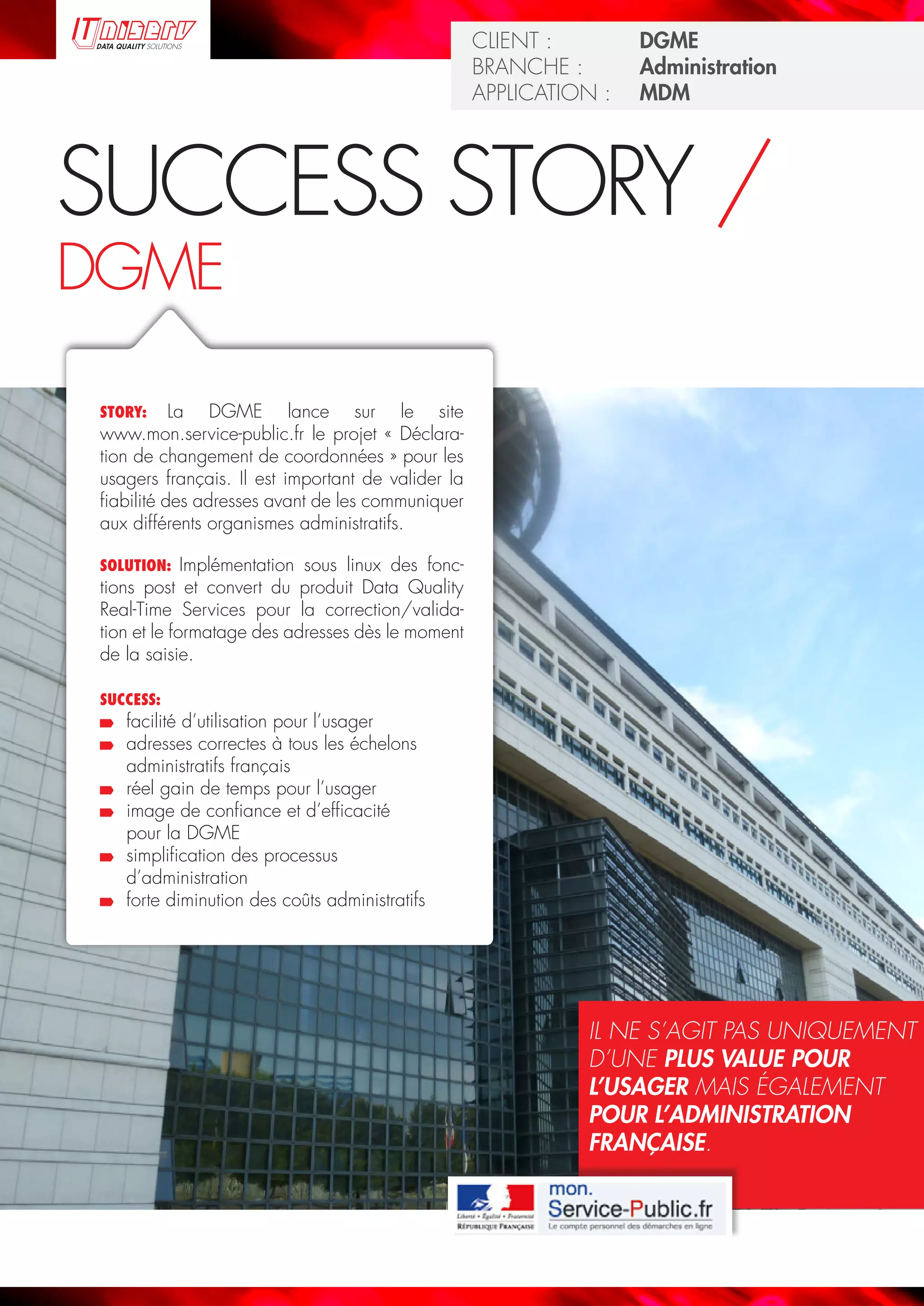 La DGME a lancé le service 'déclaration de changement de coordonnées' sur www.mon.service-public.fr, facilitant la mise à jour des adresses pour différents organismes administratifs en France. L'intégration de solutions de qualité des données permet de valider et corriger les adresses en temps réel, améliorant ainsi l'efficacité administrative et l'expérience utilisateur. Ce projet vise à simplifier les démarches en ligne et à élargir l'accès à d'autres services administratifs d'ici 2012.