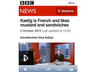 Le document traite du design web responsive en mettant l'accent sur l'accessibilité et l'amélioration progressive, en proposant des solutions adaptées aux différents navigateurs et dispositifs. Il souligne l'importance de développer pour les capacités plutôt que pour des modèles spécifiques et fait le point sur l'évolution des technologies web. Des recommandations sont fournies pour concevoir des sites web qui répondent aux attentes des utilisateurs, en intégrant des fonctionnalités adaptées aux appareils modernes.