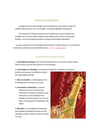 Le champagne est un vin mousseux protégé par une appellation d'origine contrôlée, célèbre pour sa méthode d'élaboration et ses cépages spécifiques. Sa renommée a été établie dès le Moyen Âge et il est devenu un symbole de célébration à travers le monde. La fabrication du champagne suit un processus en six étapes, à partir de la fermentation alcoolique jusqu'au dégorgement, et il existe des tentatives de création de variations comme le 'champagne' de banane et de pomme.