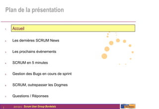Le document présente un événement Scrum Wine à Bordeaux le 26 janvier 2012, avec une structure incluant des nouvelles sur Scrum, des prochains événements, et des discussions sur la gestion des bugs en cours de sprint. Il aborde également la philosophie de Scrum en tant que cadre de travail, discutant de la nécessité d'une approche moins dogmatique. Des exercices collaboratifs sont proposés pour explorer comment appliquer les principes de Scrum à des problèmes réels.