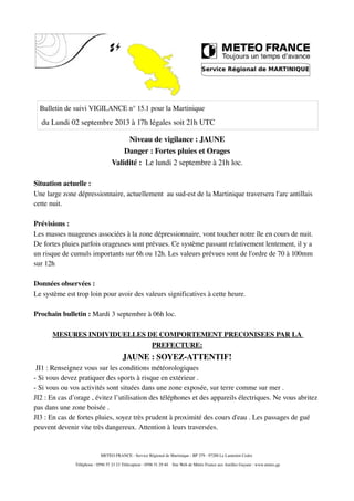 Le bulletin de suivi vigilance n° 15.1 pour la Martinique avertit d'un niveau de vigilance jaune en raison de fortes pluies et orages attendus à partir de la nuit du 2 septembre 2013. Une zone dépressionnaire affectera l'île, avec des cumuls de pluie prévus de 70 à 100 mm sur 12 heures. Des mesures de précaution sont recommandées, notamment pour éviter les risques liés aux conditions météorologiques défavorables.