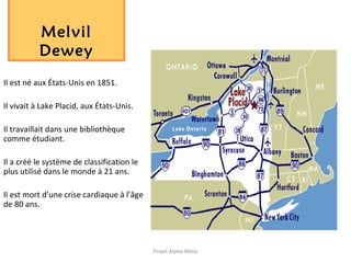 Le document présente Melvil Dewey, né en 1851 aux États-Unis, créateur du système de classification des bibliothèques, connu sous le nom de Classification Décimale de Dewey. Il décrit également les différentes classes de cette classification ainsi que le projet Alpha-Biblio, une initiative soutenue par le CDÉACF et le réseau des bibliothèques publiques de Montréal. Le projet comprend des ateliers d'initiation à la lecture animés par Line Boily.