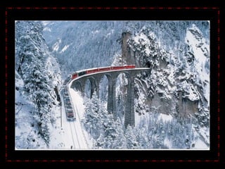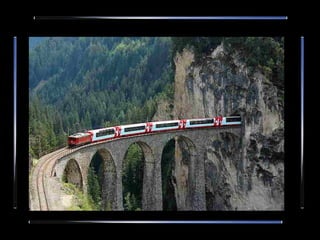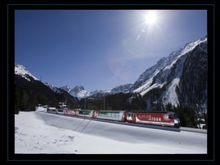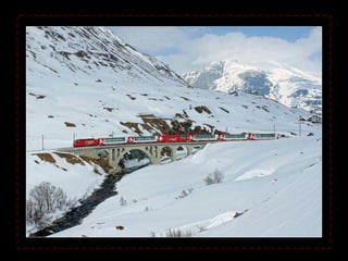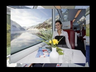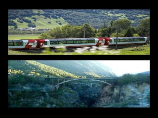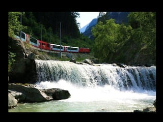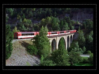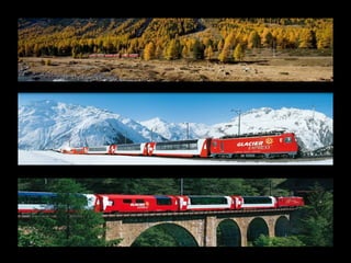 Le Glacier Express relie Zermatt à St Moritz en 7 heures et demie, traversant 291 ponts et 91 tunnels, offrant des vues panoramiques exceptionnelles. Le voyage permet d'admirer des paysages variés, allant des gorges aux lacs de montagne. Ce train emblématique a commencé son trajet en 1930 et est devenu une marque touristique renommée en Suisse.