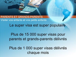 Le super visa permet aux parents et grands-parents admissibles de visiter le Canada pendant un maximum de deux ans sans renouveler leur statut, par rapport aux quatre à six mois avec un visa standard. Ce visa de multiples entrées est valide jusqu'à dix ans et offre des avantages en matière de couverture médicale et de remboursement en cas de refus. Les conditions de demande incluent la taille de la famille invitante, et il est possible d'annuler une demande de parrainage en faveur d'une demande de super visa.