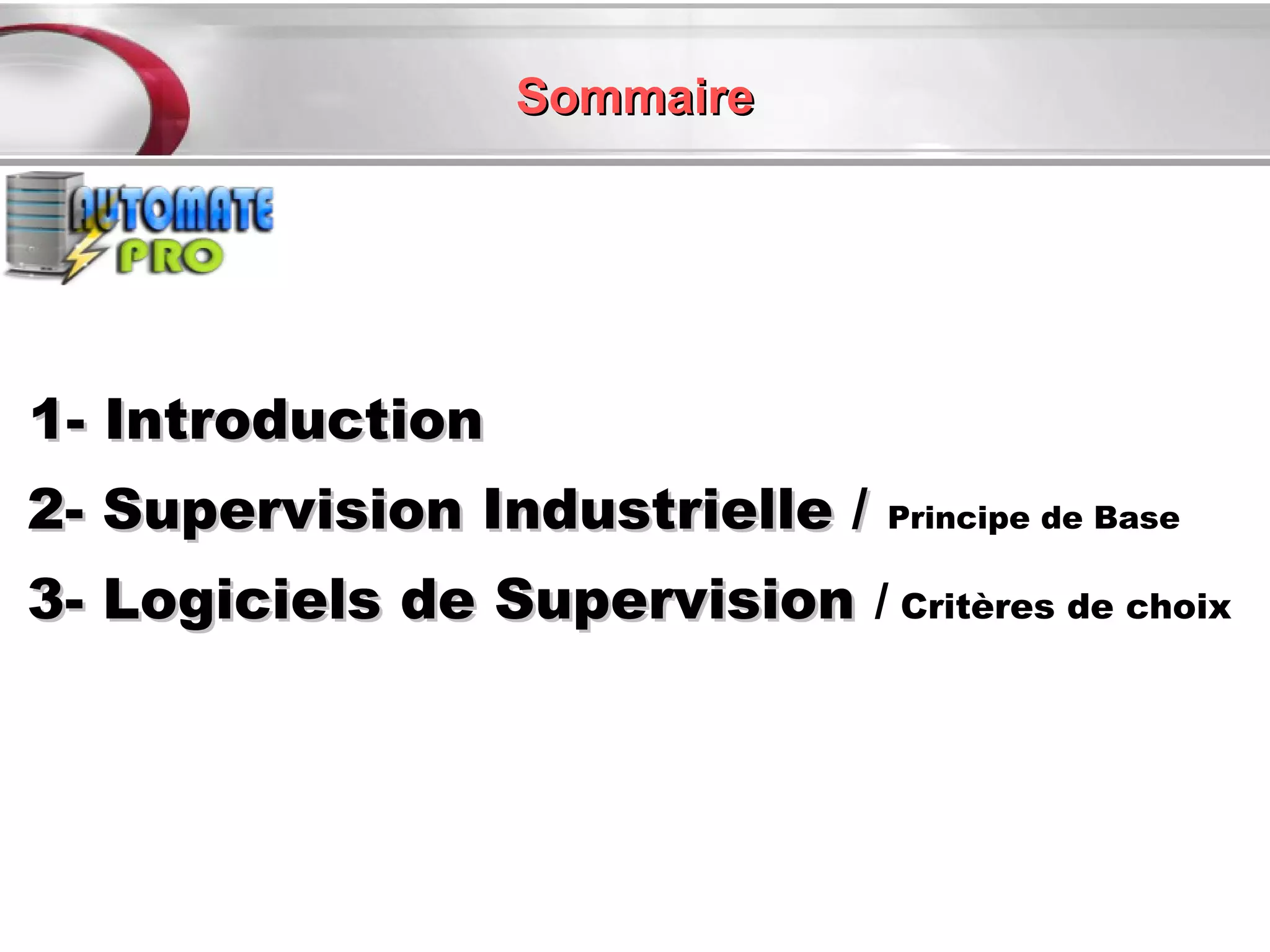 Le document explore l'évolution des systèmes de contrôle et de supervision industrielle, mettant en avant la nécessité d'automatiser et de mettre en réseau en tenant compte des performances futures. Il détaille les fonctions de base des logiciels de supervision, telles que la commande et la surveillance, ainsi que les critères de choix pour ces logiciels en matière de compatibilité opérationnelle et fonctionnelle. Enfin, il aborde les tendances vers une intégration plus étroite entre les logiciels de supervision et les équipements industriels.
