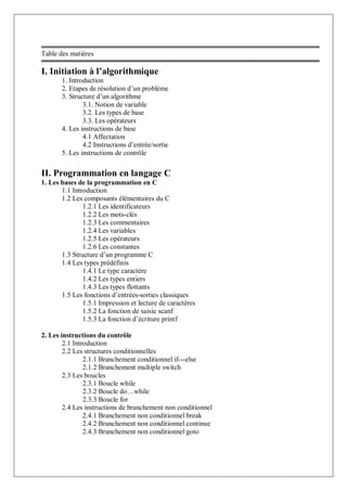 Ce document est un support de cours sur l'algorithmique et la programmation en langage C, destiné aux étudiants en deuxième année de la filière MIP. Il est structuré en deux parties : la première présente les notions de base de l'algorithmique, tandis que la seconde aborde des concepts de programmation en C, tels que la structure d'un programme, les instructions de contrôle, les tableaux, et les pointeurs. Le cours inclut également des chapitres sur les fonctions et les types composés, offrant ainsi une introduction complète à la programmation.