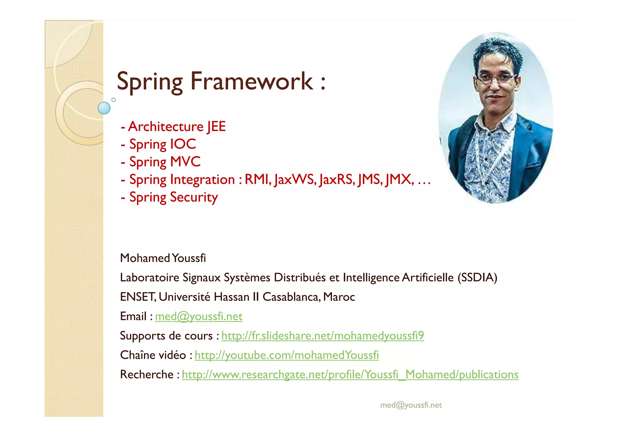 Le document traite de l'architecture et des exigences fonctionnelles et techniques pour des applications informatiques en utilisant le framework Spring. Il aborde des concepts tels que l'inversion de contrôle, le couplage fort et faible, ainsi que l'injection de dépendances. Les divers modules de Spring et leur utilité dans la création d'applications modulaires et évolutives sont également expliqués.