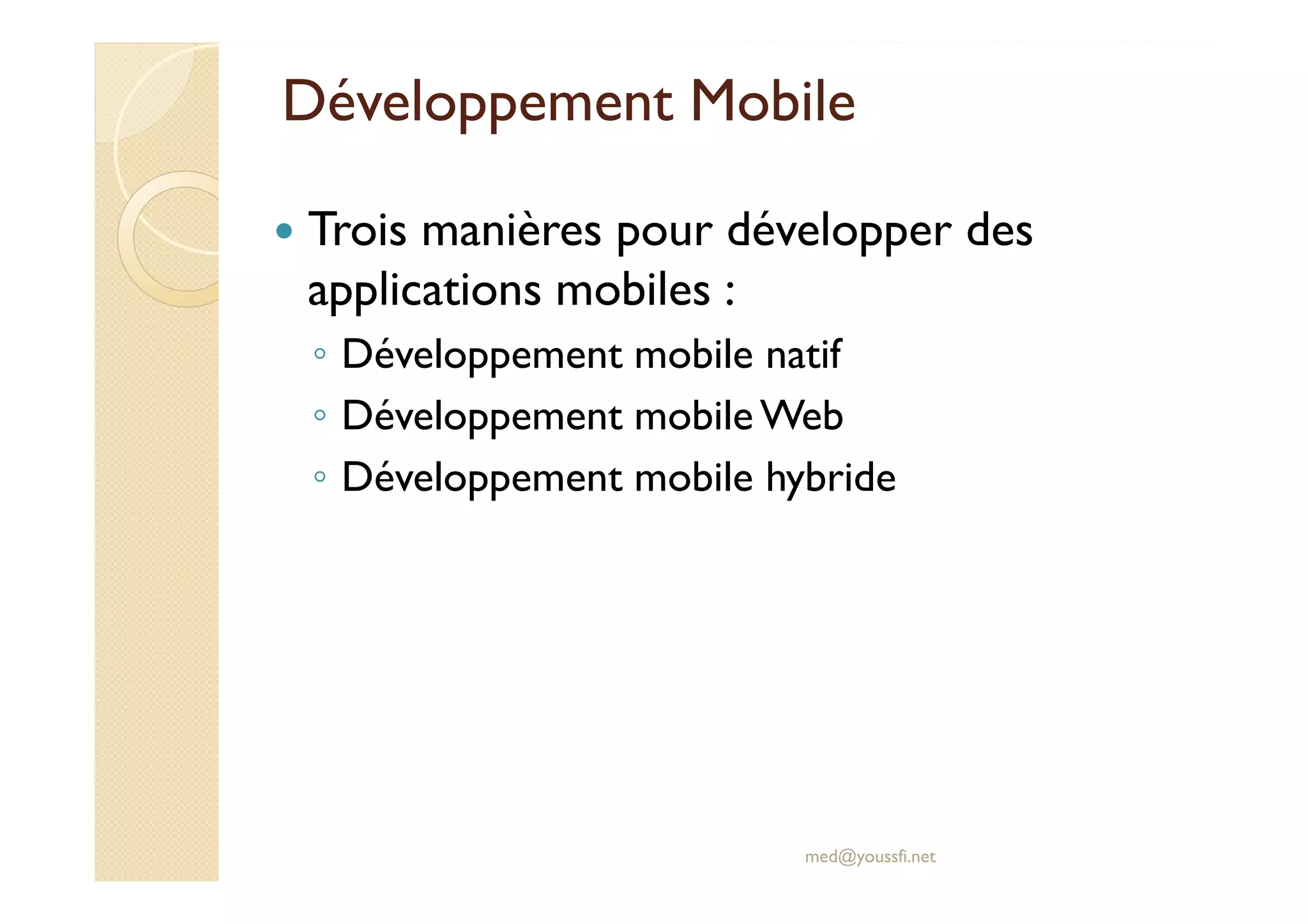 Le document traite du développement d'applications mobiles hybrides à l'aide de technologies comme Ionic et Cordova. Il explique les différences entre les applications natales, web et hybrides, ainsi que les étapes nécessaires pour créer et tester une application mobile. Les points clés incluent les outils recommandés, les langages utilisés et la structure d'un projet Ionic.