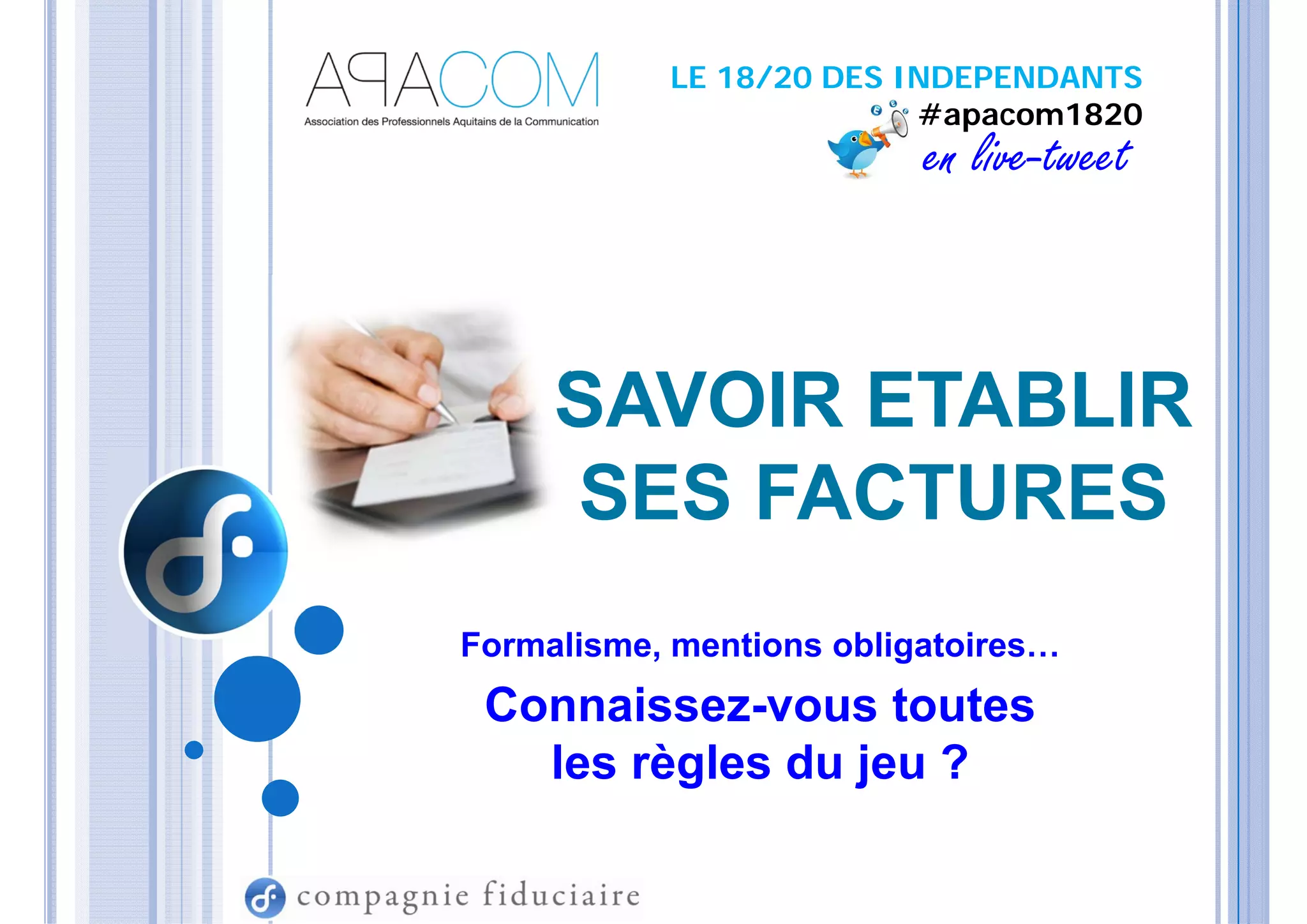Le document décrit les règles et le formalisme relatifs à l'établissement des factures en France, en précisant les mentions obligatoires ainsi que le cadre réglementaire applicable. Il souligne les obligations pour les professionnels, tant en B to B qu'en B to C, ainsi que les conséquences potentielles en cas de non-conformité, notamment des contrôles et amendes de la part des autorités fiscales. Enfin, il aborde les types de factures, le support de facturation, et les règles spécifiques sur la langue à utiliser dans les documents de facturation.