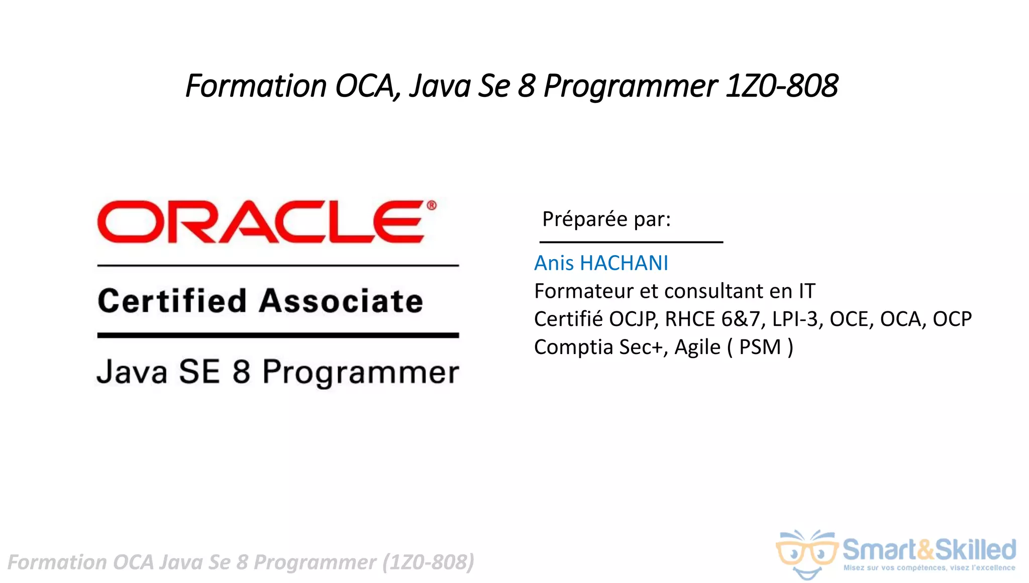 La formation OCA Java SE 8 Programmer (1Z0-808) se concentre sur l'acquisition de compétences essentielles en développement Java, mettant en avant la certification Oracle comme un atout pour les professionnels. Le programme couvre divers aspects tels que l'orienté objet, la gestion des exceptions, et les concepts fondamentaux de la langue Java. Cette formation s'adresse aux développeurs Java et à ceux familiarisés avec d'autres langages orientés objet, en les préparant à l'examen de certification.