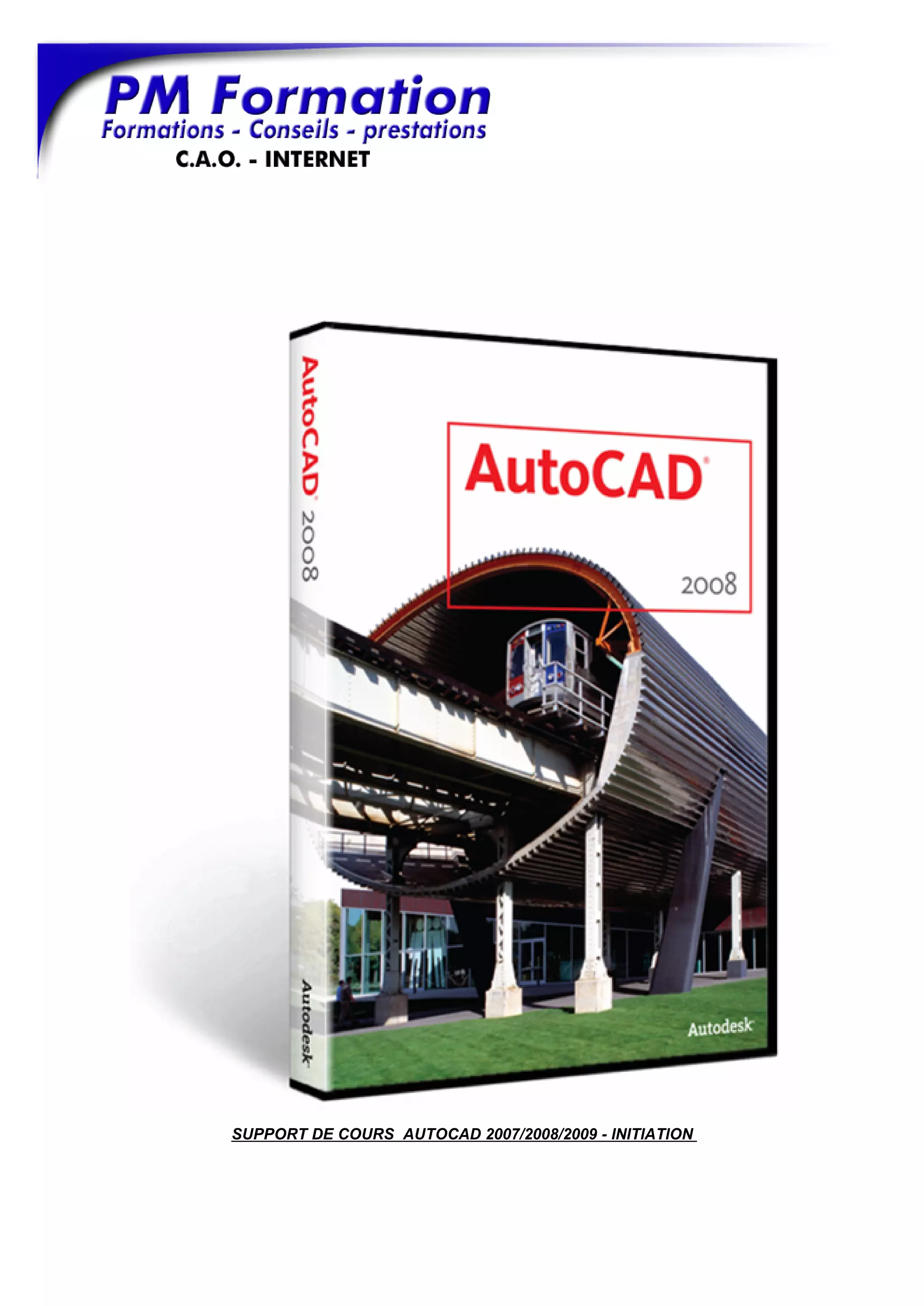 Ce document est un support de cours sur AutoCAD 2007/2008/2009, présentant les fonctionnalités et commandes essentielles du logiciel de dessin assisté par ordinateur. Il couvre l'historique des versions, la configuration de l'interface utilisateur, les types d'objets courants, les systèmes de coordonnées et les commandes de base utilisées pour créer des dessins. Le document inclut également un aperçu des mises à jour des versions et des outils Autodesk complémentaires pour faciliter le travail avec AutoCAD.