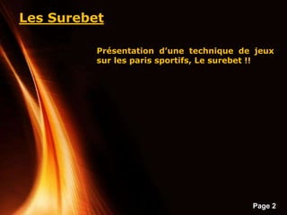 Le document présente le concept de surebet, une stratégie de paris sportifs permettant de garantir un bénéfice en misant sur tous les résultats possibles d'un événement, tout en expliquant comment détecter et répartir les mises. Il décrit également des techniques pour optimiser les paris en utilisant différentes cotes sur plusieurs bookmakers et aborde l'utilisation de bonus offerts par ces sites. Enfin, le document met en garde sur les conditions associées aux bonus et les stratégies pour éviter les pertes potentielles.