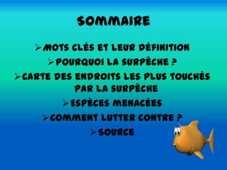 Le document aborde la problématique de la surpêche, soulignant ses causes telles que la mauvaise gestion des pêcheries et les innovations technologiques. Il présente également les conséquences sur les espèces menacées, accompagnées d'une carte des zones les plus affectées. Enfin, il propose des solutions pour lutter contre la surpêche, y compris des plans de l'Union européenne et le développement de la pisciculture.